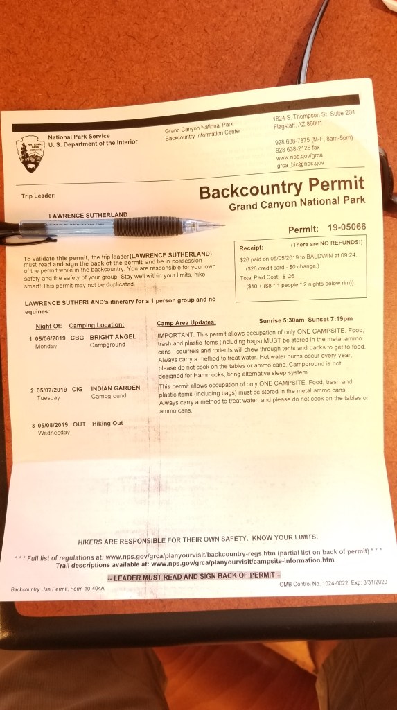 The park services always have campsites available for lottery draw. It’s pretty much a guarantee to get a permit I went to the Backcountry Information Center and they issued a lottery ticket for the next morning 8:00am drawing and acquired permits for the next two nights. The first night at Bright Angel Campground and the second night at Indian Garden Campground.